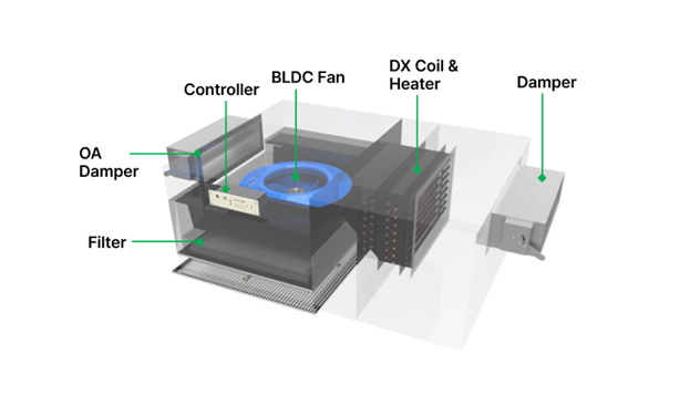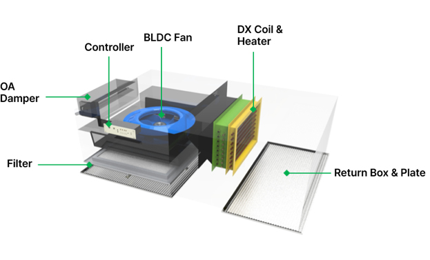 Equipment that recovers indoor waste heat while maximazing the efficacy of the heat pump cycle to minimize power consumption for cooling/heating sources and achieve optimal indoor ventilation. Combination of Heat Exchanger & Energy Saving Equipment Energy-saving air handling unit.